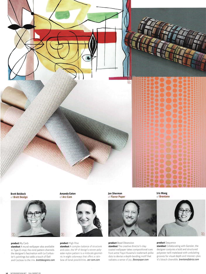 Big ups to theInterior Designteam for toasting our Bead Obsessionwallpaper (bottom, right) in its Fall Market Tabloid issue. This fresh outta theFlavor Kitchen handscreenedpattern celebrates ourNew Orleansroots, as it's inspired by the shameless sensory overabundance of Mardi Gras and all of those beads...in the air, the gutters, the trees, your drink, your hair — EVERYWHERE. It also nods to dot obsessed Yayoi Kusama, resulting in a depth-bending beaded motif that undulates with a sense of infinite goodness. ID picked Papaya to spotlight, but it's also offered in Creampuff, Kravtiz Gold and Licorice colorways. As always, if you have another color combo in mind just give us a shout since we're down to create something that satisfies your appetite.