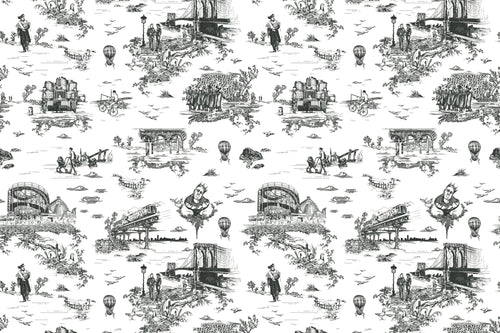 Mike Diamond of the Beastie Boys collaborated with Vincent J. Ficarra and Adela Qersaqi of the creative agency Revolver New York to design a bespoke wallpaper to bring his unique Brooklyn vibe to his brownstone. Brooklyn Toile is a modern homage to Brooklyn in classic French toile de Jouy style, featuring scenes from Coney Island to Borough Hall to the Fulton Mall. With etchings of The Notorious B.I.G., elevated subways, pigeons, the Brooklyn Bridge, and b-boys mackin' with boomboxes, this wallpaper is the King's borough. Na' mean?